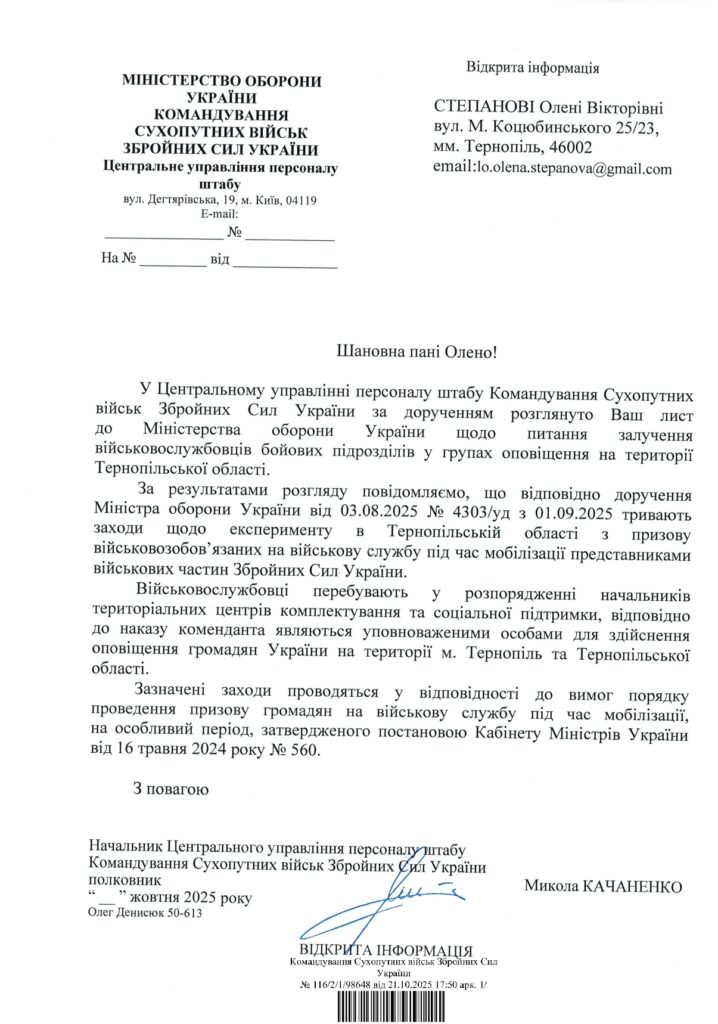 У Тернополі адвокатка Олена Степанова заявила, що мешканців області перетворили на “піддослідних” у межах експерименту Міністерства оборони. Йдеться про залучення військовослужбовців бойових підрозділів до роботи у групах оповіщення під час мобілізації.