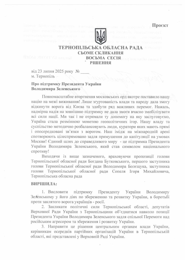 Під час чергової сесії Тернопільської обласної ради депутати ухвалили звернення на підтримку Президента України Володимира Зеленського. За документ проголосували 37 депутатів.