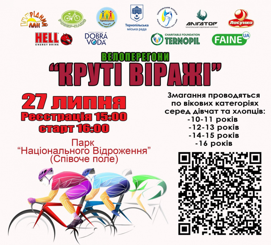 27 липня у Тернополі відбудуться змагання з велосипедного спорту серед аматорів «Круті віражі». До участі запрошують дітей віком з 10 по 16 років.