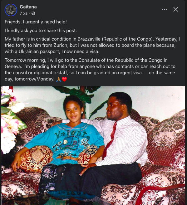 «Мій батько у критичному стані в Браззавілі. Вчора я намагалася вилетіти до нього, але мені не дозволили сісти в літак, бо з українським паспортом тепер потрібна віза. Завтра вранці я йду до консульства Республіки Конго в Женеві. Прошу допомоги у всіх, хто має контакти або може зв’язатися з консулом чи дипломатами, щоб мені терміново надали візу», — написала Гайтана.